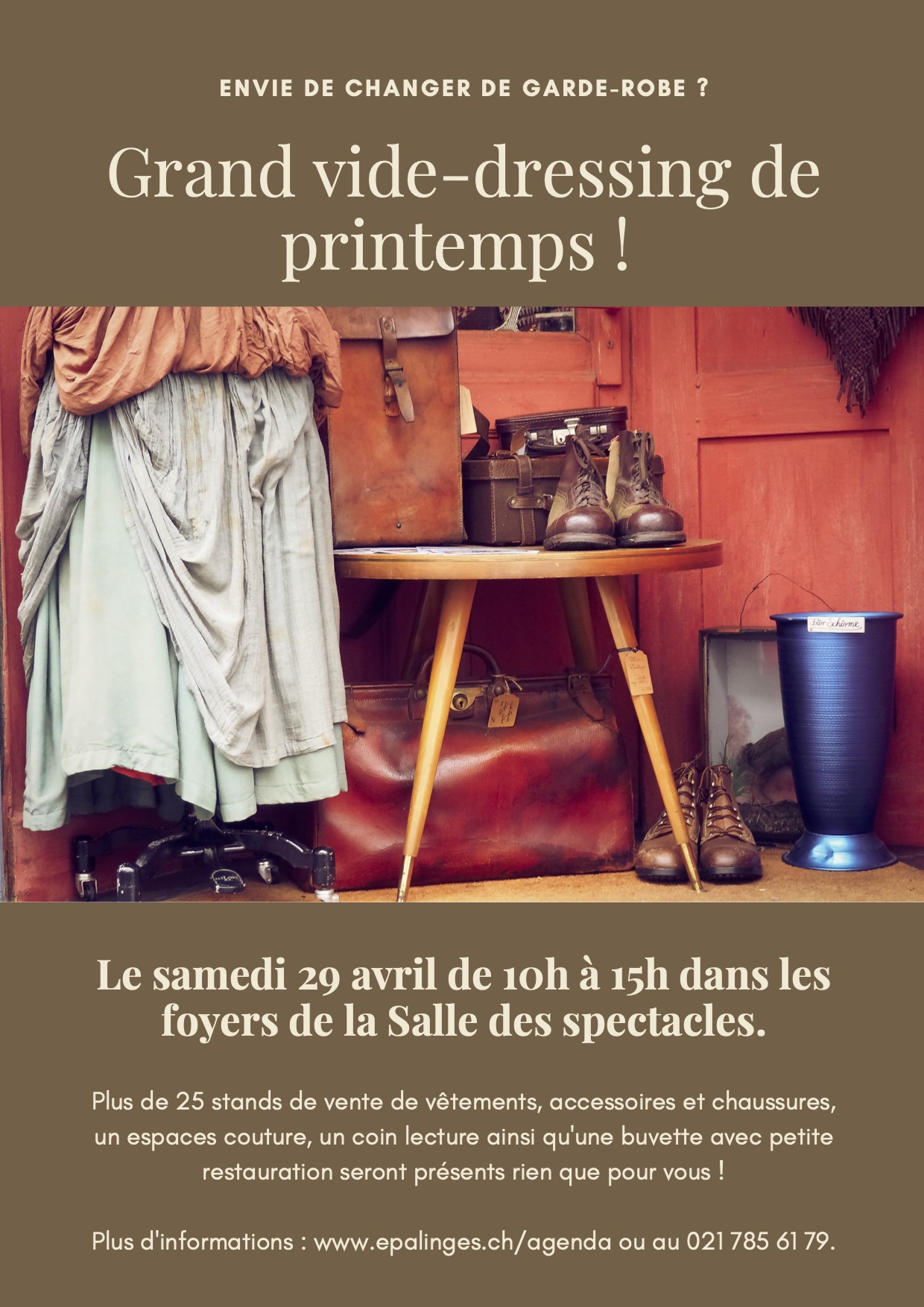 de participer avec nous au grand vide-dressing organisé par la commune. L’occasion de trouver des nouvelles affaires pour pas grand-chose et/ou de récolter un peu d’argent à partir d’affaires que tu ne portes plus. Un vaste programme !! L’accueil libre sera fermé, passe nous dire bonjour et surtout faire un petit tour de shopping! Nous serons à la salle des spectacles, de 10h00 à 15h00!