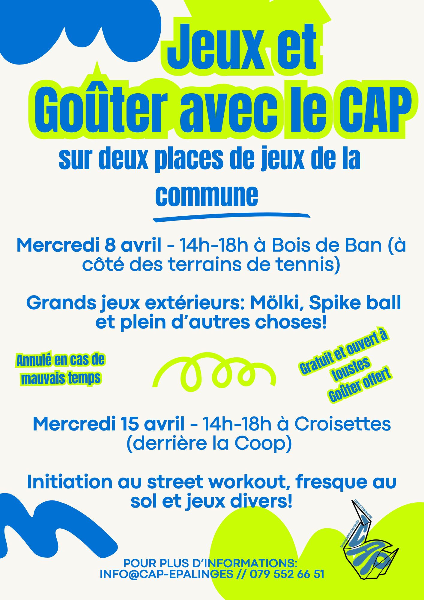 Durant les vacances de Pâques, le CAP vous propose deux après-midi de rencontres et d’animation sur des places de jeux de la commune.