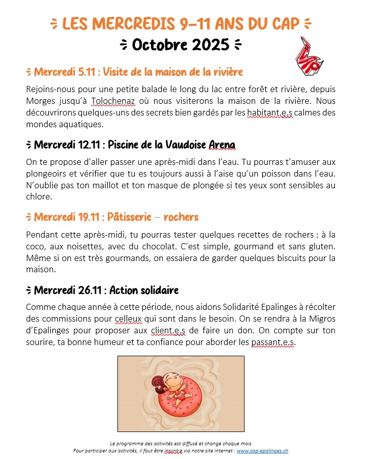 Inscription : Dorénavant, les inscriptions aux activités Mercredis 9-11 ans se font en ligne, sur le site du CAP toutes les infos ici !