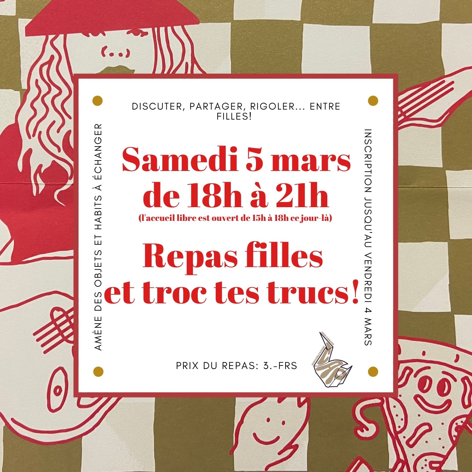 Le mardi 8 mars, c’est la journée internationale des droits des femmes. Pour fêter cette date importante dans la lutte contre les inégalités par rapport aux hommes, le CAP te propose une soirée filles avec au programme un succulent repas et du troc d’objets. Amène des objets et des habits à échanger si tu en as.