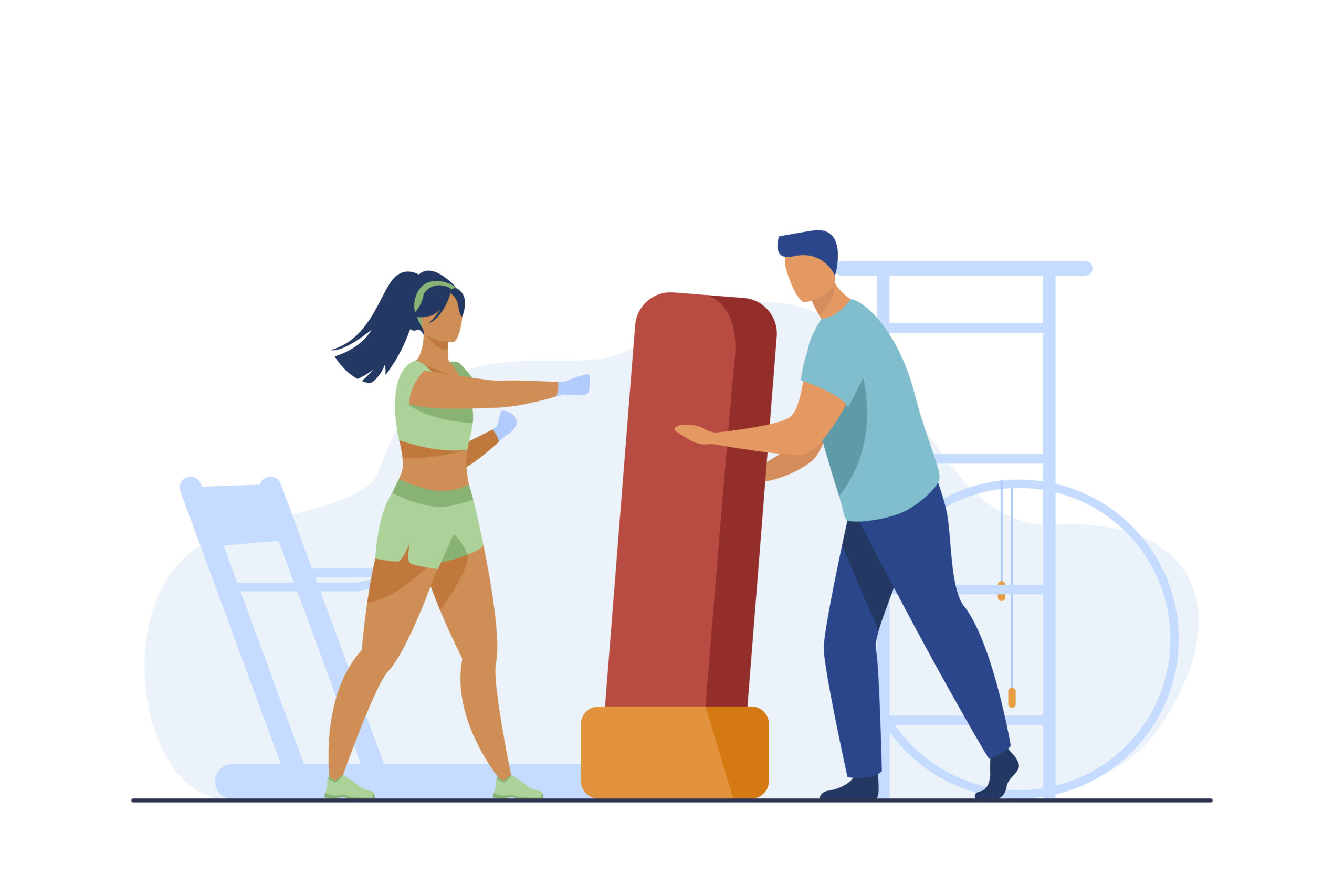 Trainer holding boxing bag for woman. Kickboxing, gym, athlete flat vector illustration. Sport and training concept for banner, website design or landing web page