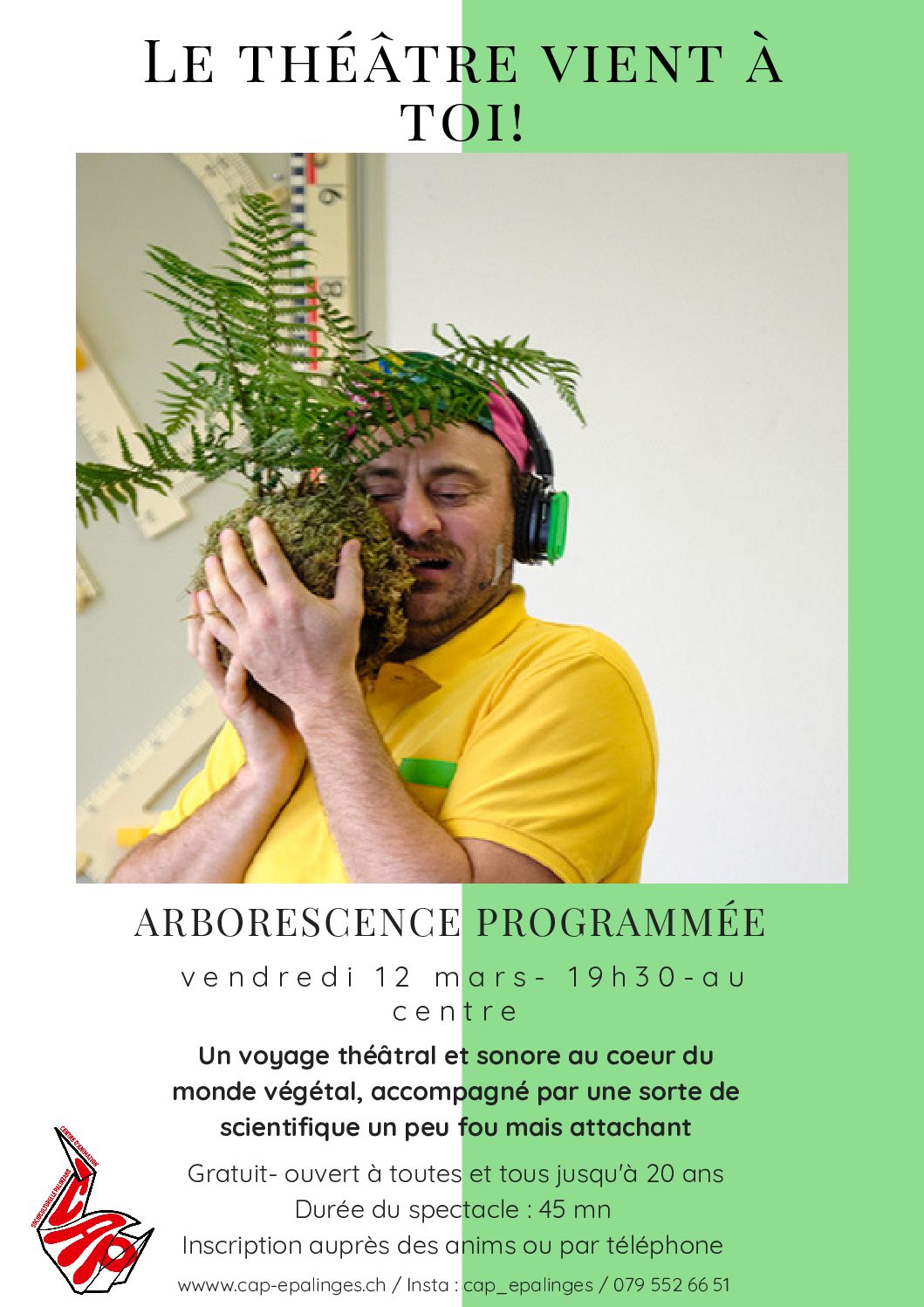 On ne peut pas aller au théâtre, alors le théâtre vient à nous ! Nous recevons au CAP la pièce "Arborescence programmée" de Muriel Imbach : Porté par un comédien, sorte de scientifique un peu fou et attachant, le spectacle aborde les questions d’environnement et d’écologie "par la marge", de manière sensible et poétique plutôt […]