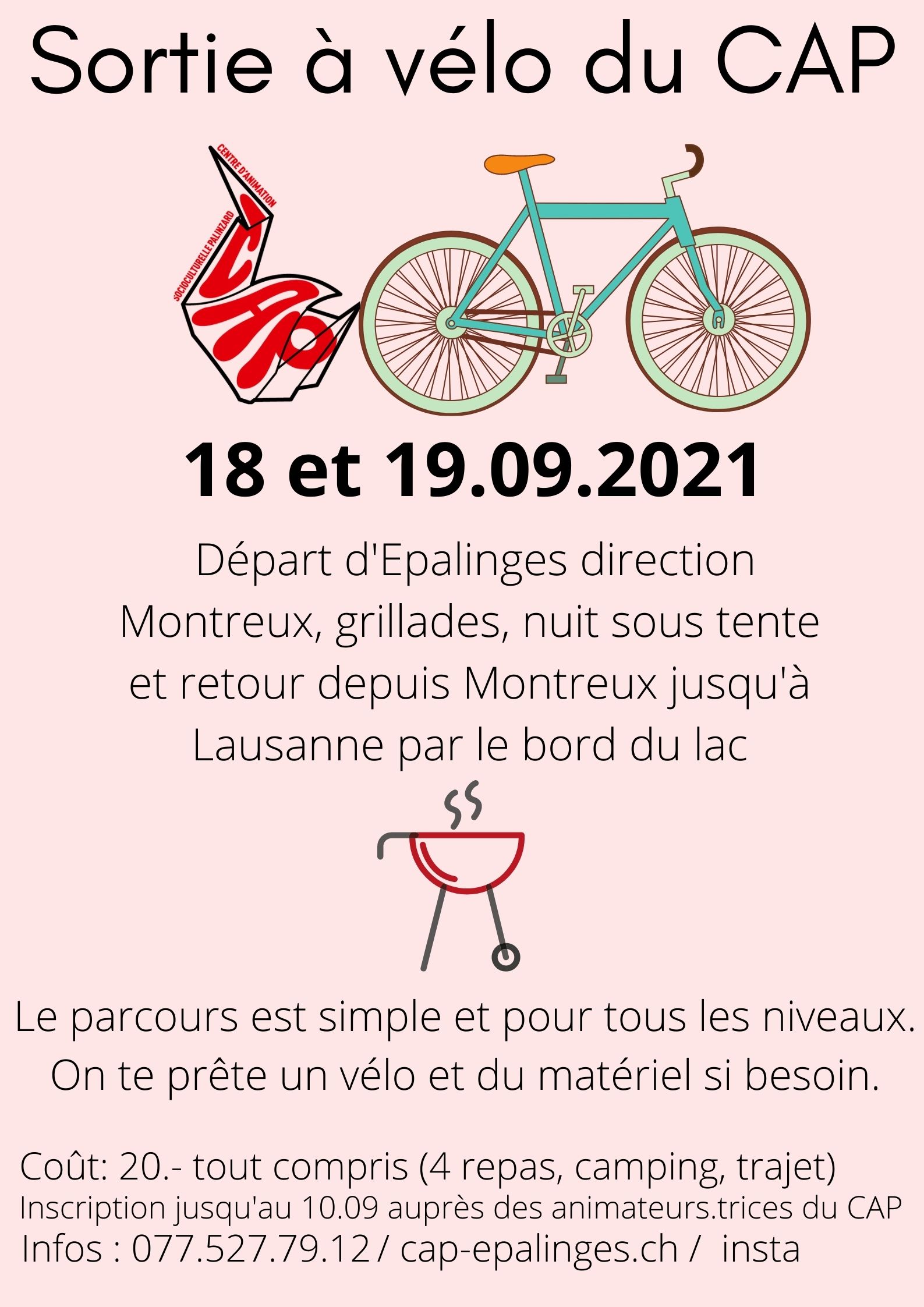 | 0 évènement, | 0 évènement, | 0 évènement, | 0 évènement, | 0 évènement, | 1 évènement, Mis en avant En route pour cette rentrée ! Départ d'Epalinges direction Montreux, grillades, nuit sous tente et retour depuis Montreux jusqu'à Lausanne par le bord du lac. Le parcours est simple et pour tous les niveaux. On peut prêter des vélos et du matériel si besoin. Coût: 20.- tout compris (4 repas, camping, trajet). Inscription jusqu'au 10.09 auprès des animateurs.trices du CAP, ou téléchargez sur le site une "inscription à une sortie", à rendre durant les heures d'ouverture de l'accueil libre du CAP. Pour toutes questions et infos, vous pouvez nous contacter au 077.527.79.12 ou par mail à info@cap-epalinges.ch 20CHF | 1 évènement, |