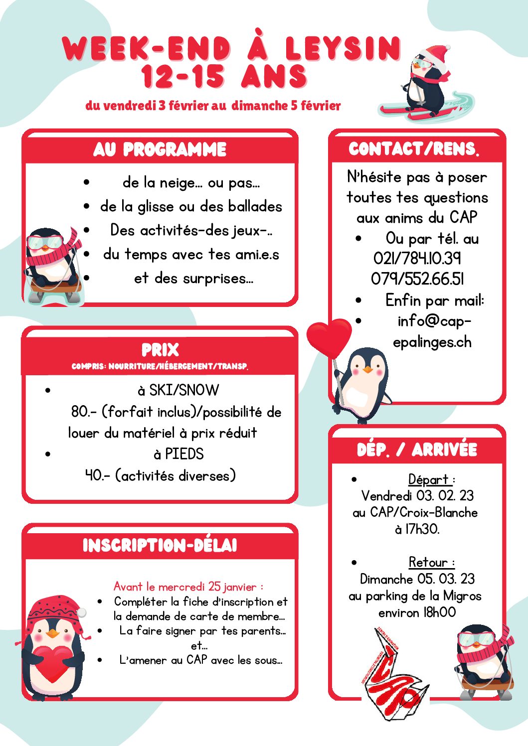 A ski ou en snow, débutant ou avancé, on te propose une petite bouffée d'air frais le temps d'un week-end au chalet de l'Espérance, à Leysin avec tes amis. Si tes pieds ont grandi et que tu n'arrives plus à enfiler tes bottes de ski, pas de soucis, on t'aidera à trouver le matériel qu'il te manque pour presque rien... Alors pas d'excuse, peu importe ton niveau de glisse ou l'état de ta combi, ose te lancer dans l'aventure!
