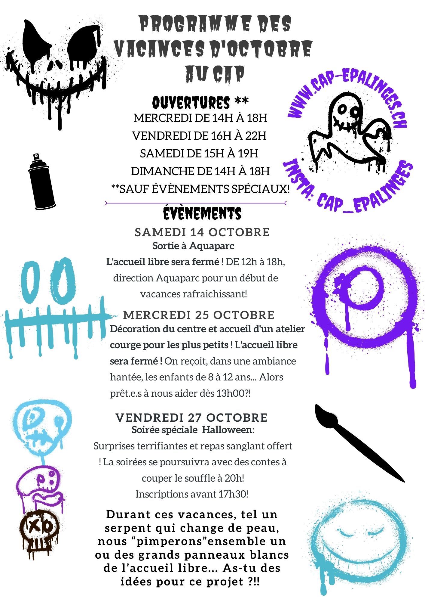 Durant les vacances d'octobre l'accueil libre reste ouvert aux horaires habituels ! Venez nombreux.euses profiter du CAP "en mode vacances": se lancer dans des soirées sushis, préparer des cookies, décorer le centre au couleur de Halloween ou encore découvrir des nouveaux jeux de société et même profiter de ne rien faire !