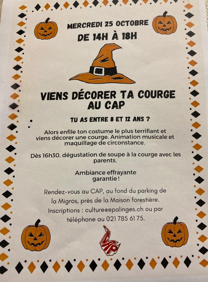 **Attention: Pour inscrire les enfants de 8 à 12 ans à la "courge Party" du 25.10, merci d'envoyer un mail directement à culture@epalinges.ch ou par téléphone au 021 785 61 75