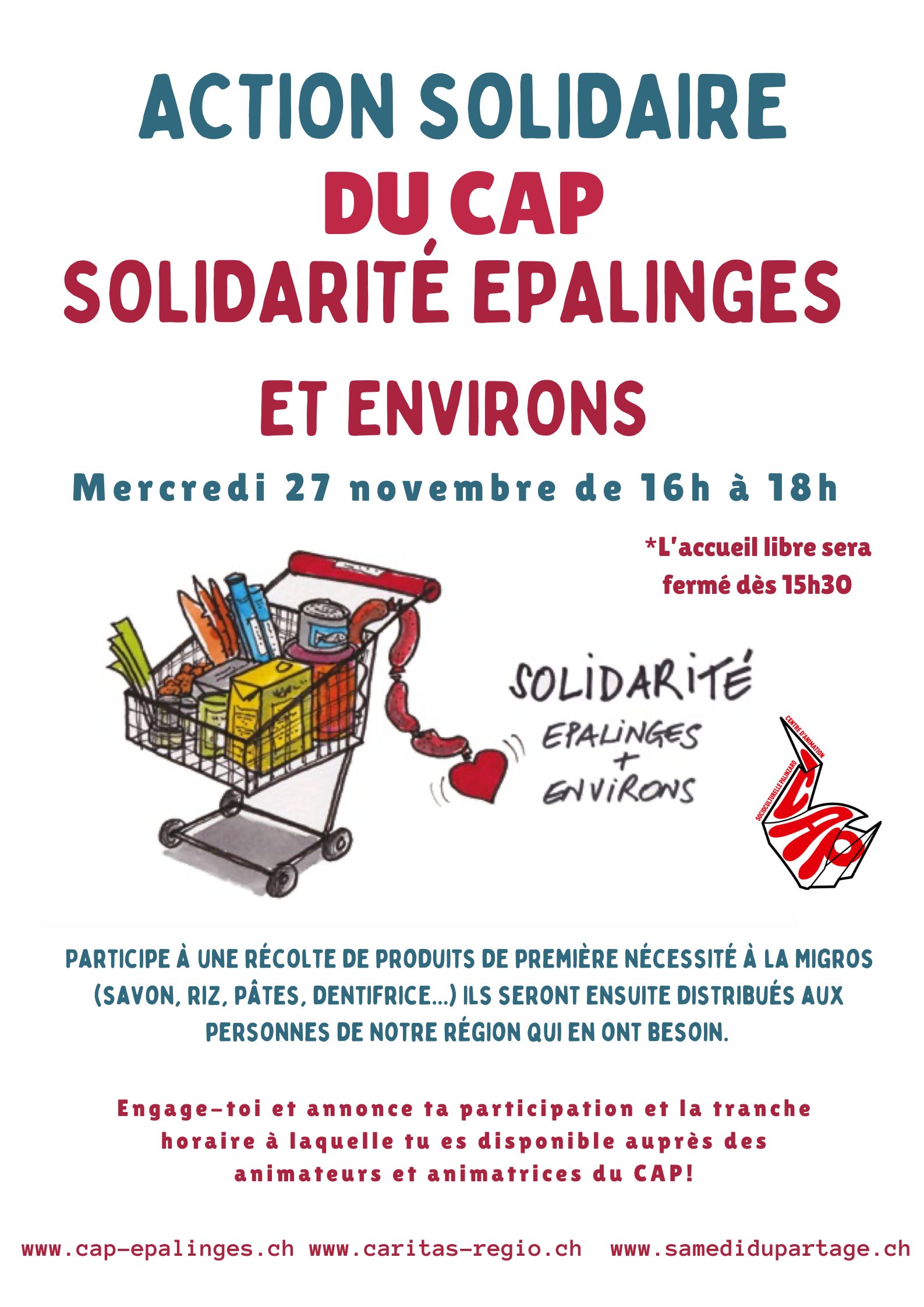 Engage-toi pour l'action solidaire du CAP et participe à une récolte de produits de premières nécessité à la Migros qui seront ensuite remis à l'association des Cartons du coeur!